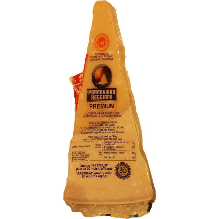 Parmigiano Reggiano AOP avec distinction Premium, surpassant les exigences du Consortium. Fromage parfait, marqué par son affinage et ses cristaux.