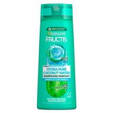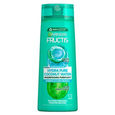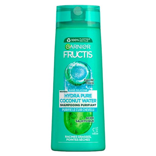 Fructis associe dans sa formule des agents purifiants à l'Eau de Coco hydratante pour purifier le cuir chevelu et les racines, tout en apportant hydratation et douceur aux longueurs.