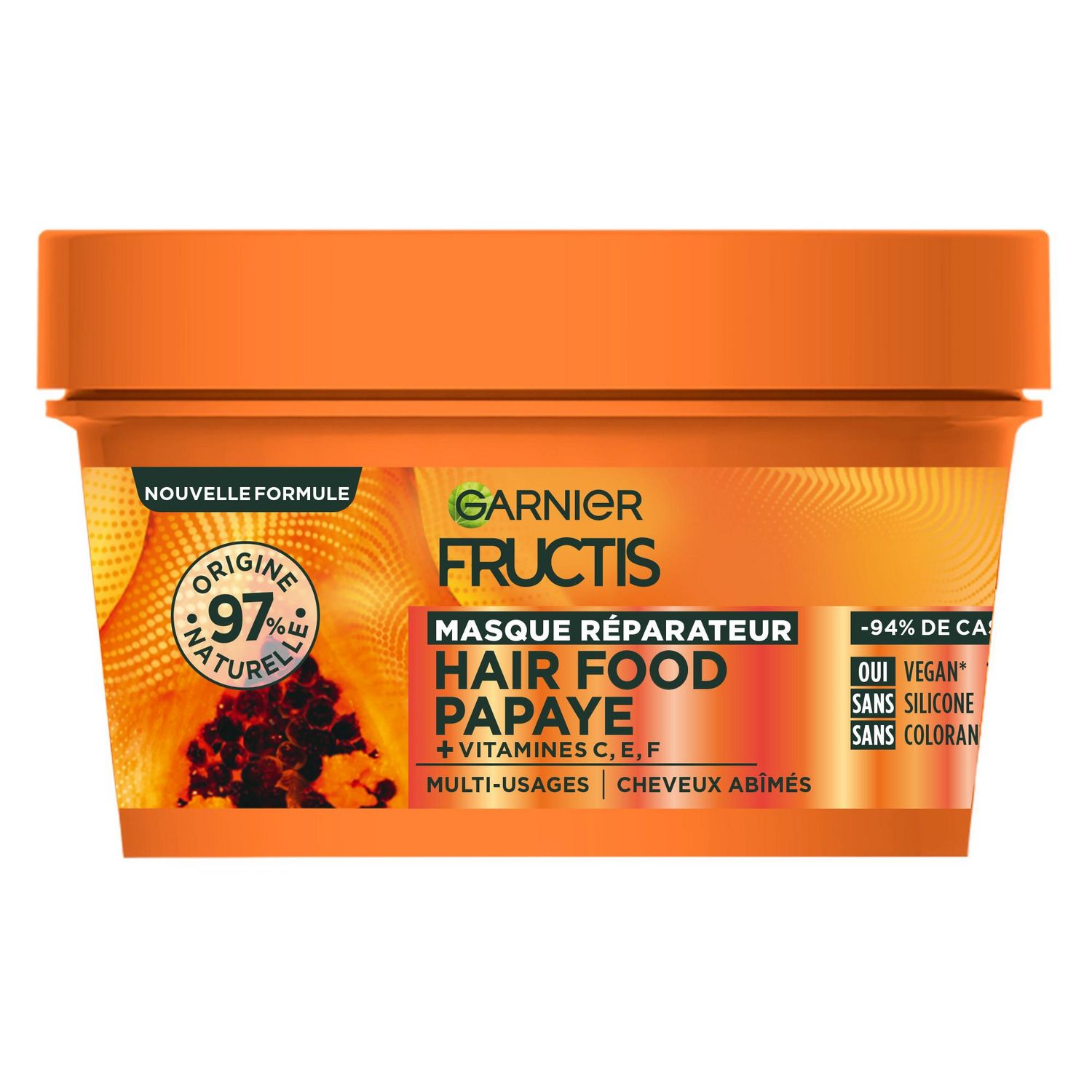Découvrez notre masque Hair Food ultra-nourrissant à la papaye ! Sa texture généreuse & sa nouvelle formule enrichie en vitamines C, E & F* réparent le cheveux en profondeur pour 94% moins de casse** . * dérivés de vitamines C et F ** Test instrumental - 94% de casse