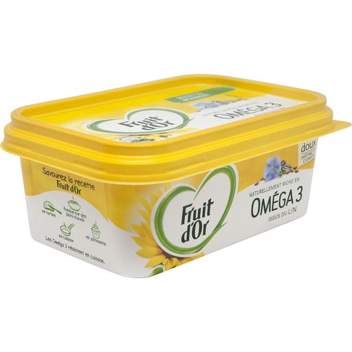 Margarine allégée (60% M.G.) enrichie en vitamines A et D, aux huiles 100% végétales. Depuis plus de 40 ans Fruit d’Or met la nature au service de votre santé. Issue de la pression d’un mélange unique de graines de tournesol, de lin et de colza, la margarine Fruit d’Or Doux est naturellement riche en Oméga 3 bons pour votre cœur* et contient de la vitamine E, un antioxydant naturel** pour vous aider à prendre soin de vous et à optimiser votre bien-être. Les Oméga 3 sont des acides gras dits essentiels, c’est à dire que notre corps ne sait pas les fabriquer. C’est donc notre alimentation qui doit nous les apporter. Saviez-vous qu’on estime que 99% des français ont des apports insuffisants en oméga 3*** ? En tartine, en cuisson, en pâtisserie ou fondue sur les plats chauds, la margarine Fruit d’Or Doux vous régalera ! Besoin d’inspiration pour vos recettes ? Jetez un œil sur fruitdor.fr dans l’onglet recette. Vous y trouverez toutes nos idées recettes pour un repas réussi ! *Les Oméga 3 (ALA) contribuent au maintien du cholestérol. Les effets bénéfiques des Oméga 3 sont obtenus par la consommation journalière de 2g d'ALA dans le cadre d’un régime adapté. **La vitamine E contribue à protéger les cellules contre le stress oxydatif. ***Rapport de l’Anses, l’agence française de sécurité des aliments.