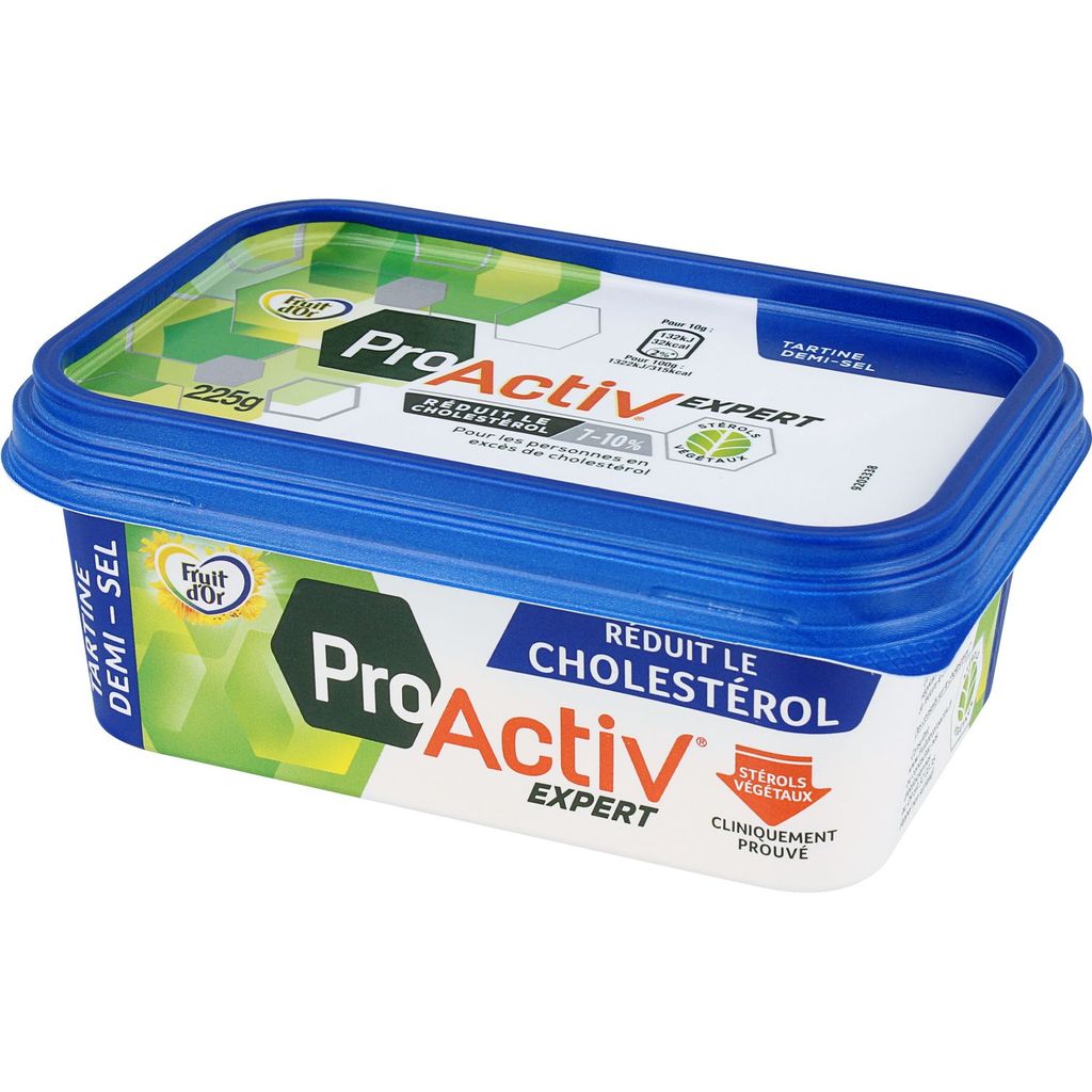 Fruit d'Or ProActiv EXPERT®: la seule* margarine (*en France) enrichie en stérols végétaux qui réduisent significativement le cholestérol ! Fruit d'Or ProActiv EXPERT® Tartine Demi-Sel est une margarine allégée à tartiner contenant 35% de matière grasse. Grâce à l'action naturelle des stérols végétaux, Fruit d'Or ProActiv EXPERT vous permettra de réduire votre taux de cholestérol de 7 à 10% en 21 jours seulement. Il vous aidera aussi au quotidien à lutter contre un des facteurs de risque des maladies cardio-vasculaires. Consommer 30g de Fruit d’Or ProActiv EXPERT® par jour permet d’obtenir la dose journalière de stérols végétaux pour réduire significativement votre cholestérol. 30g par jour, c’est facile : à déguster sur votre tartine au petit-déjeuner, dans vos sandwichs ou encore sur vos toasts à l’heure de l’apéritif. Parfait pour une cuisine saine et équilibrée. Alors laissez-vous tenter et commencez dès aujourd'hui à réduire votre cholestérol ! Fruit d’Or ProActiv EXPERT® : -Réduit le cholestérol de 7 à 10% en 21 jours seulement -50 études démontrent l’efficacité des stérols végétaux contenus dans Fruit d’Or ProActiv EXPERT -Est un produit issu d’un mélange de graines de tournesol, lin et colza qui contient des Omega 3 & 6 -Contient uniquement des arômes et colorants d’origine naturelle -Doit être consommé dans le cadre d’une alimentation équilibrée et d’un mode de vie sain Pour plus d'informations : http://www.fruitdorproactiv.fr/