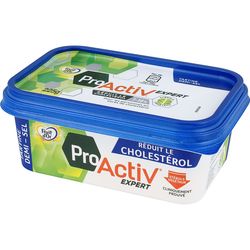 Fruit d'Or ProActiv EXPERT®: la seule* margarine (*en France) enrichie en stérols végétaux qui réduisent significativement le cholestérol ! Fruit d'Or ProActiv EXPERT® Tartine Demi-Sel est une margarine allégée à tartiner contenant 35% de matière grasse. Grâce à l'action naturelle des stérols végétaux, Fruit d'Or ProActiv EXPERT vous permettra de réduire votre taux de cholestérol de 7 à 10% en 21 jours seulement. Il vous aidera aussi au quotidien à lutter contre un des facteurs de risque des maladies cardio-vasculaires. Consommer 30g de Fruit d’Or ProActiv EXPERT® par jour permet d’obtenir la dose journalière de stérols végétaux pour réduire significativement votre cholestérol. 30g par jour, c’est facile : à déguster sur votre tartine au petit-déjeuner, dans vos sandwichs ou encore sur vos toasts à l’heure de l’apéritif. Parfait pour une cuisine saine et équilibrée. Alors laissez-vous tenter et commencez dès aujourd'hui à réduire votre cholestérol ! Fruit d’Or ProActiv EXPERT® : -Réduit le cholestérol de 7 à 10% en 21 jours seulement -50 études démontrent l’efficacité des stérols végétaux contenus dans Fruit d’Or ProActiv EXPERT -Est un produit issu d’un mélange de graines de tournesol, lin et colza qui contient des Omega 3 & 6 -Contient uniquement des arômes et colorants d’origine naturelle -Doit être consommé dans le cadre d’une alimentation équilibrée et d’un mode de vie sain Pour plus d'informations : http://www.fruitdorproactiv.fr/ Matière grasse allégée à tartiner (35% M.G.) demi-sel, aux esters de stérol végétal et enrichie en vitamines A et D.