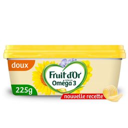 Chez Fruit d'Or, nous n'utilisons que le meilleur de la nature. Sans huile de palme, sans conservateur et sans arôme artificiel, la recette Fruit d'Or est 100% végétale et contient des Oméga 3* ! Sa recette est issue d'un mélange d'huiles de tournesol, de lin et de colza et est enrichie en vitamine D. Sa texture onctueuse unique grâce à l'huile de coco, rend Fruit d'Or Oméga 3* délicieux aussi bien en tartine qu'en cuisson et pâtisserie. Et si vous passiez au végétal ? *Les Oméga 3 contribuent au maintien d'un taux de cholestérol normal. Les effets bénéfiques des Oméga 3 sont obtenus par la consommation journalière de 2g dans le cadre d'un régime adapté.