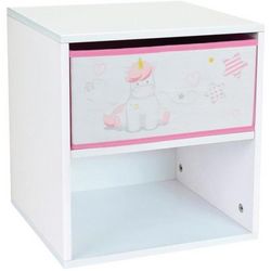 Table de chevet theme Licorne pour enfant, avec une structure en MDF de dimension L 33 x P 30 x H 36 cm. Livré a l'unité, ce meuble de chambre possede un rangement. Facile a monter soi-meme.