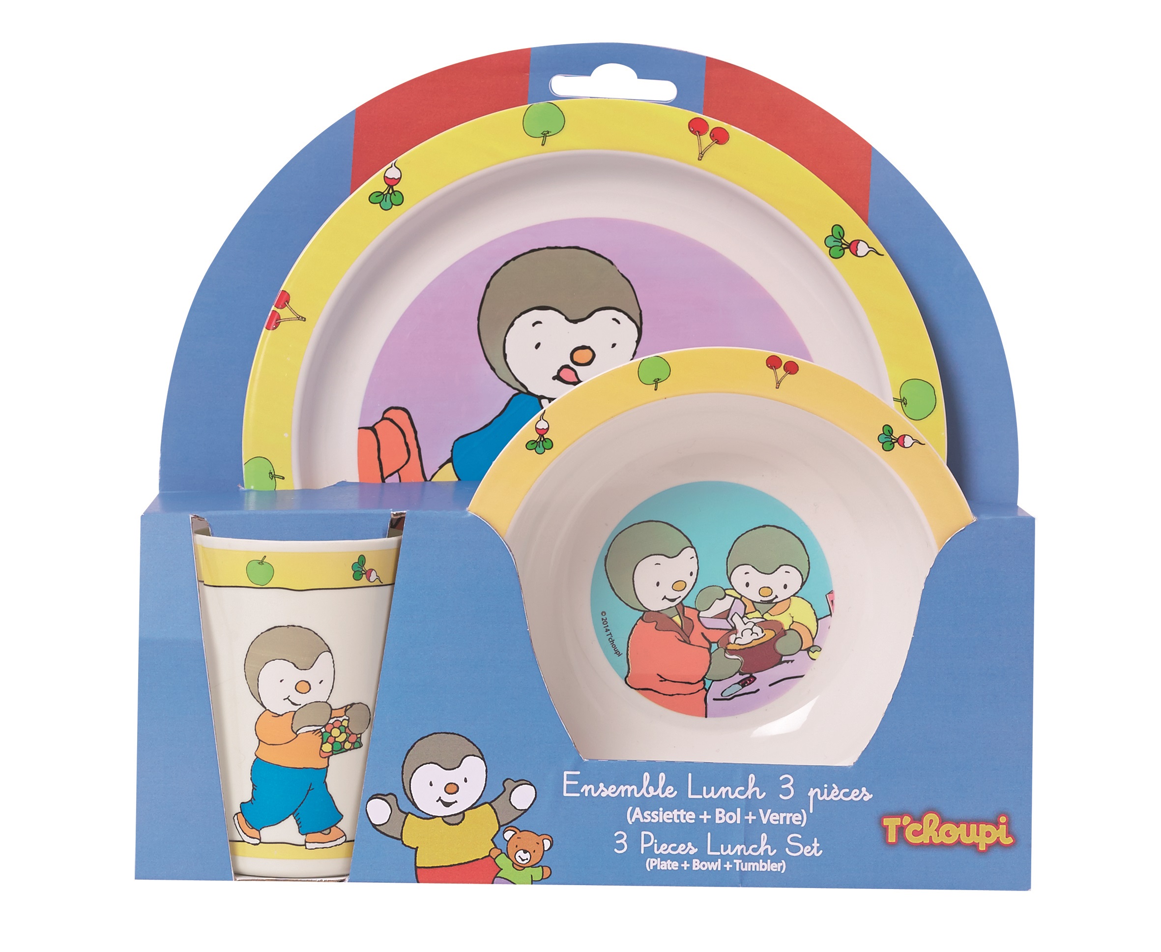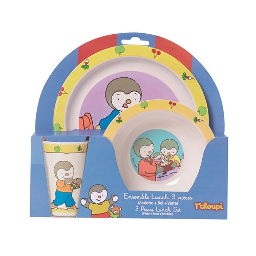 Ensemble repas T'CHOUPI composé de: 1 assiette et 1 bol en PP micro ondable et 1 verre simple en PP, contenance 220 ml.