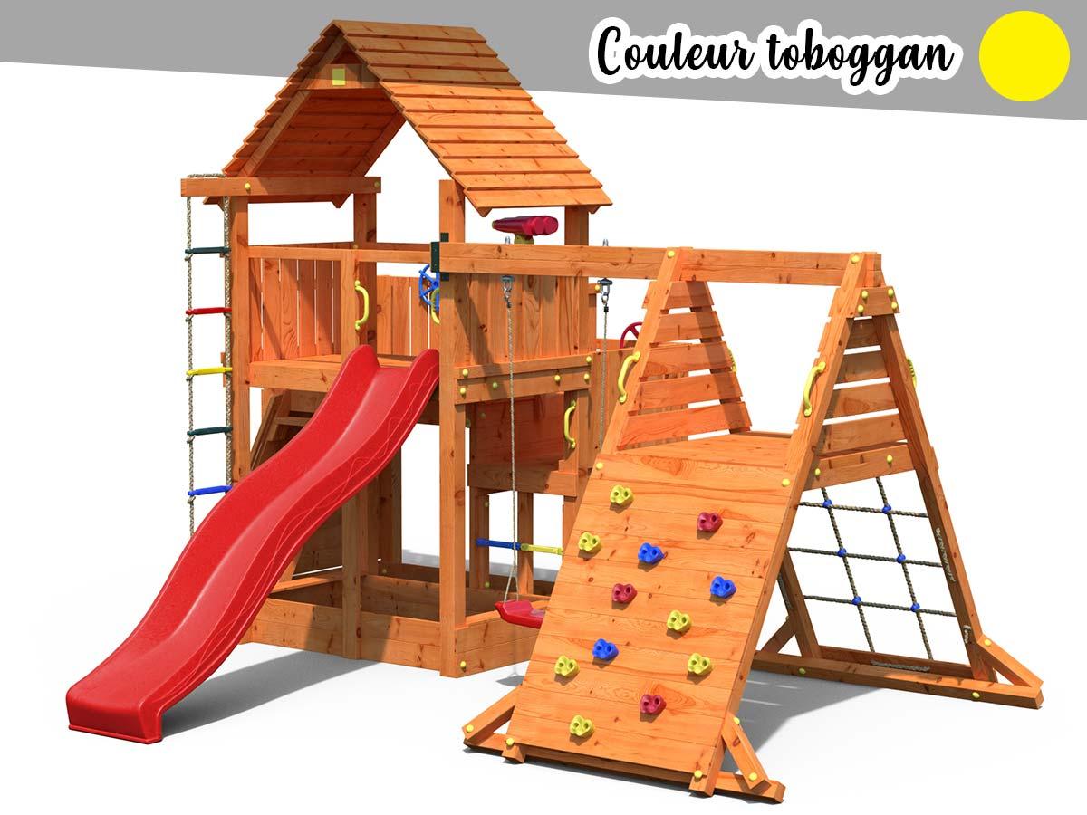 - Toboggan : d'une longueur de 2,90 m, il permet de descendre de la tour à toute vitesse. Il est disponible en 3 coloris : jaune, rouge ou bleu. Choisissez la couleur dans la liste déroulante !
