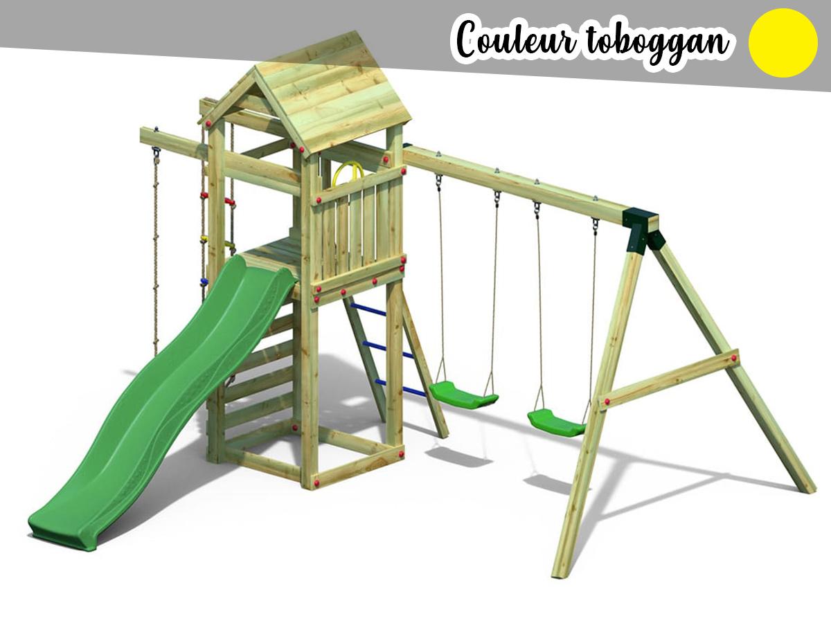 - Un toboggan coloris au choix (vert, belu, jaune ou rouge) avec glissade double vague mesurant 2,2 m.