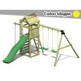 Aire de jeux Gaia - Funggo.Nombre maximum d'utilisateurs : 9Bois en Pin Sylvestre Autoclave Classe 3 FSCNorme EN 71Temps de montage : 8 heures à 2 personnesGarantie : 2 ansÉquipement : Un toboggan coloris au choix (vert, belu, jaune ou rouge) avec glissade double vague mesurant 2,2 m.Une échelle à b