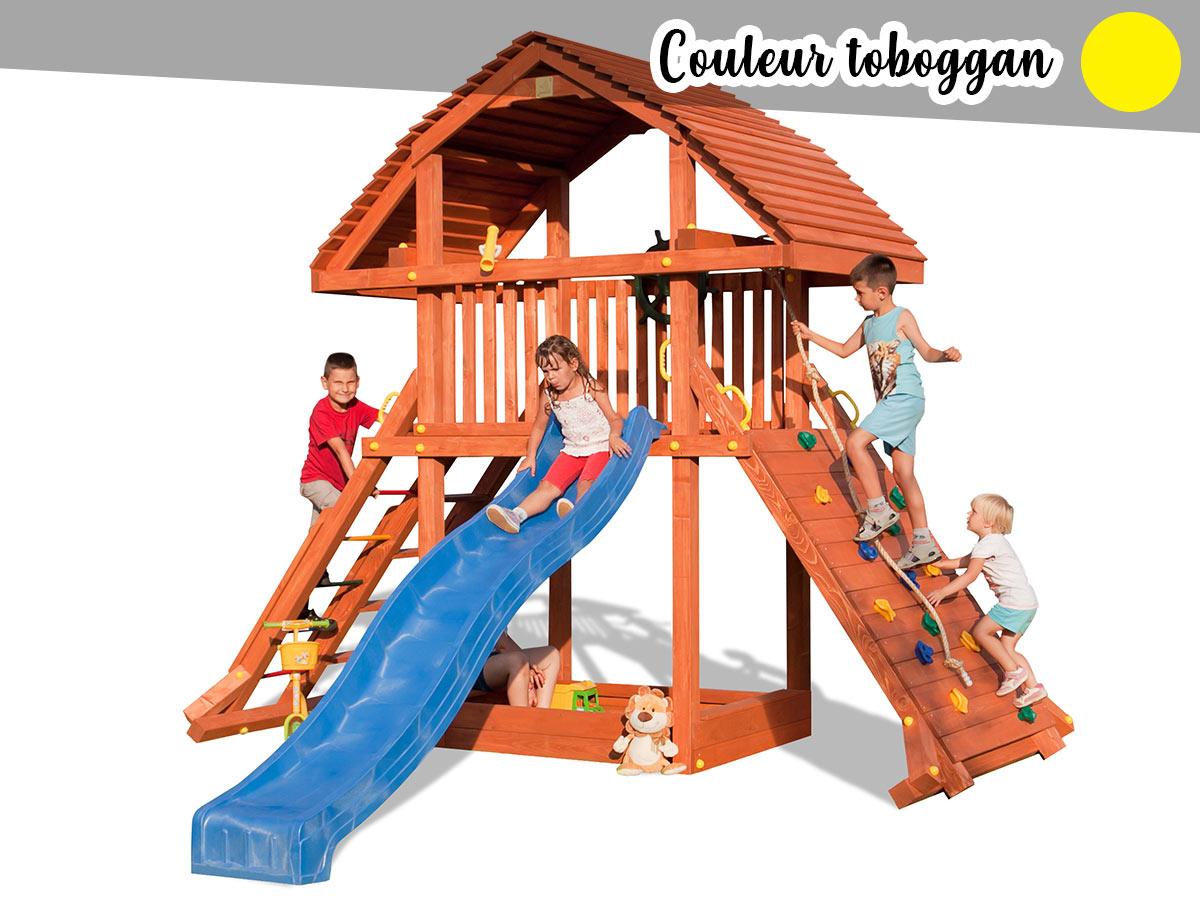 - Un toboggan avec glisse double vague mesurant 2,9 m (coloris au choix).