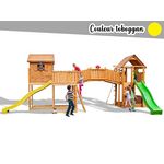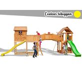 Aire de jeux en bois Maxi Plaza de FungooCette aire de jeux se compose de 2 maisonnettes et de 2 modules :Maisonnette MySideToboggan 2,9mAncrages au solCapuchonsSupportsKit de bois coupéEnsemble de connecteurs métalliquesEnsemble d'outils d'installationInstructions d'installation étape par étape a