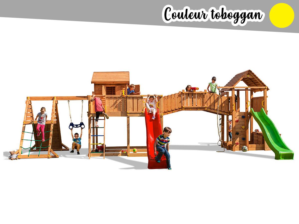 2 toboggan de 2,9 m, 2 murs d'escalade, une echelle en corde, une corde à grimper, une plateforme supérieure avec toit en bois, un pont en bois, filet à grimper, cabane en bois avec terrasse, trapèze, comptoir de jeu.