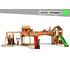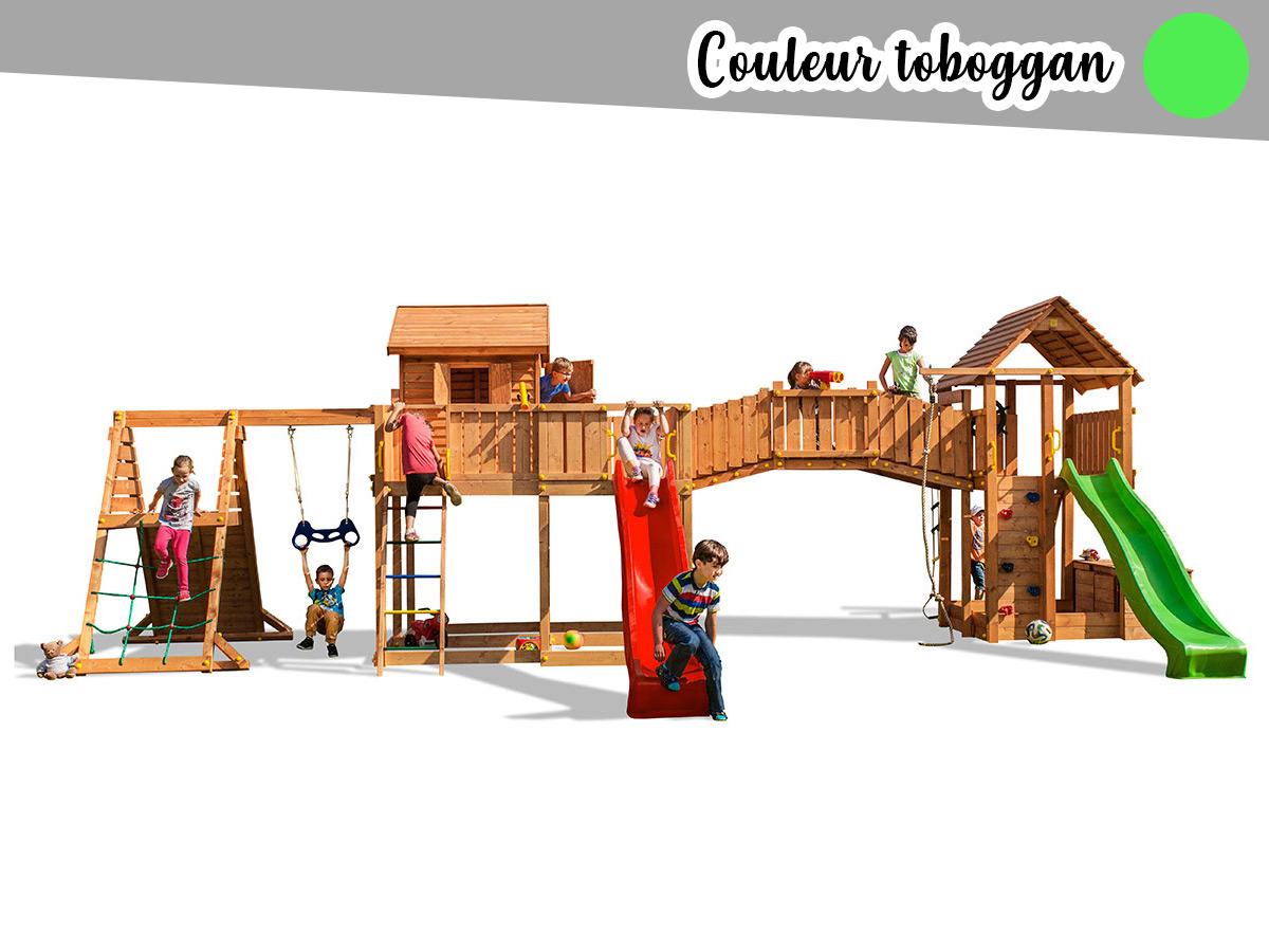 2 toboggan de 2,9 m, 2 murs d'escalade, une echelle en corde, une corde à grimper, une plateforme supérieure avec toit en bois, un pont en bois, filet à grimper, cabane en bois avec terrasse, trapèze, comptoir de jeu.
