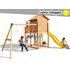 Elle se compose d'une maisonnette en bois sur piloris, avec porte, fenêtre et volets, toboggan, volant et échelle pour grimper.