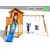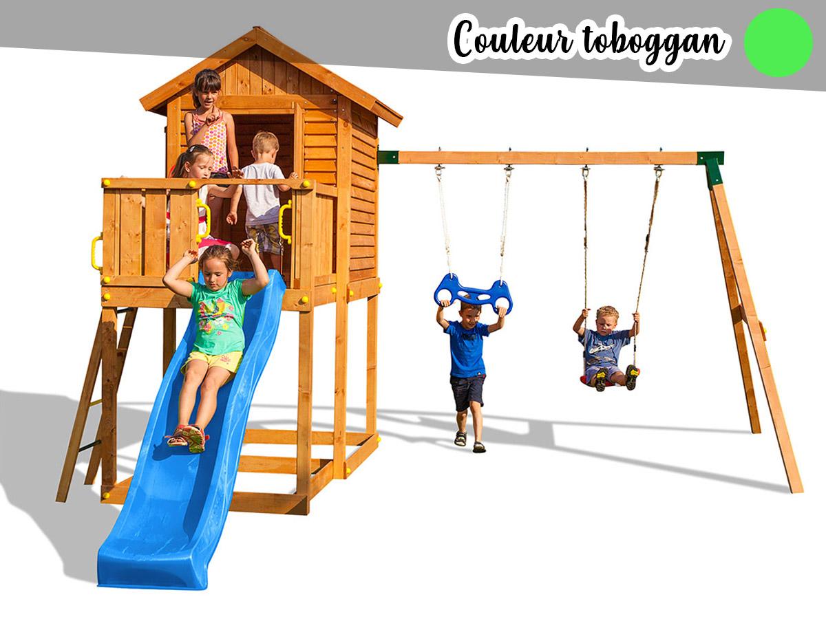 Aire de jeux en bois complète pour enfant à partir de 3 ans, avec une cabane surélevée, un toboggan et un portique avec 2 agrès.