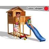 Composé d'une maisonnette sur pilotis, d'un toboggan, d'une échelle et d'un volant, les enfants prendront plaisir à jouer sur cette aire de jeux !