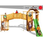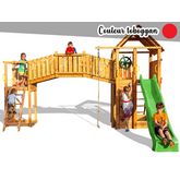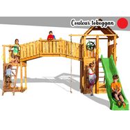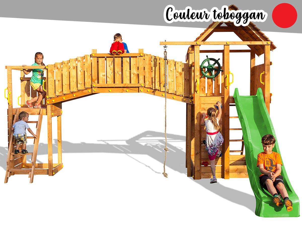 toboggan de 2,9 m, 2 murs d'escalade, une echelle en corde, une corde à grimper, une plateforme supérieur avec toit en bois, jumelles et gouvernail, un grand pont en bois.
