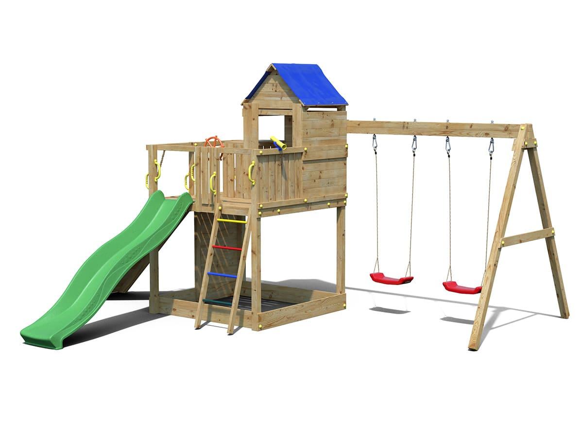 Aire de jeux TreeHouse - Funggo.Nombre maximum d'utilisateurs : 12Bois en Pin Sylvestre Autoclave Classe 3 FSCNorme EN 71Temps de montage : 8 heures à 2 personnesGarantie : 10 ansÉquipement :Un toboggan de couleur vert avec glisse double vague mesurant 2,2 m.Une échelle à barreaux métalliques.Un por