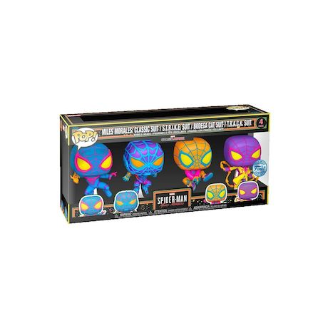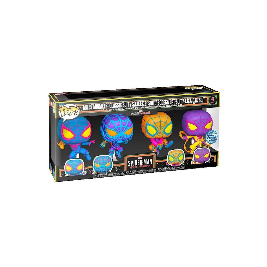 Ce pack Funko Pop! comprend quatre figurines de Miles Morales dans divers costumes emblématiques. Fabriqués en vinyle de haute qualité, ces figurines mesurent environ 9,5 cm de hauteur. Chaque figurine est colorée et stylisée, présentant des détails méticuleux et des poses dynamiques qui illustrent parfaitement l'univers Spider-Man. Ce pack est idéal pour les collectionneurs et fans de Marvel, utilisable comme élément décoratif ou cadeau. Les figurines sont légères et robustes, parfaites pour une collection durable. Aucune instruction d'usage spécifique ni avertissement particulier, mais éviter l'exposition prolongée à la lumière directe pour préserver les couleurs.