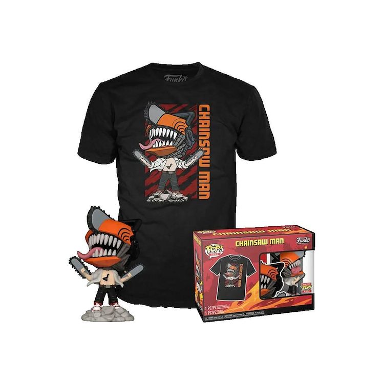 Ce set officiel Funko comprend un t-shirt noir de la marque Funko, fabriqué en tissu de haute qualité pour assurer confort et durabilité. Le t-shirt présente un design dynamique du personnage Chainsaw Man. Le set inclut également une figurine en vinyle mesurant environ 9 à 9,5 cm, idéale pour les co