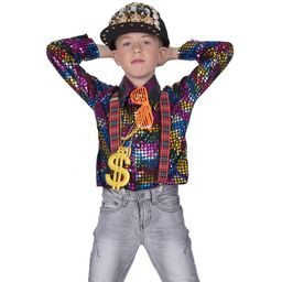 8/10 ans (128 à 140 cm) - Contenu : 1 chemise.La chemise est noire. Elle a des pois multicolore roses, bleus, verts, rouges, dorés et argentés. Les pois ont un effet métallique pour briller de mille feux sur la piste ! La chemise possède un grand col.Ce produit ne contient pas les bretelles, la casquettes, les lunettes, le collier et le pantalon.Instructions de lavage : ne pas laver en machine, ne pas passer au sèche linge, ne pas repasser Age minimum : la naissance