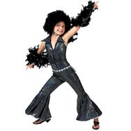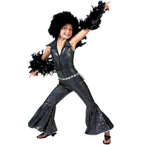 8/10 ans (128 à 140 cm) - Contenu : 1 combinaison et 1 paire de manchettes.Ce déguisement se compose d'une combinaison et de manchettes assorties. Le tissu est noir avec des effets à pois holographiques pour un côté ultra lumineux sur la piste de danse ! La combinaison est sans manches avec un grand col. Le bas est coupé en pantalon patte d'éléphant.Ce produit ne contient pas de perruque, boa, ceinture et chaussures.Instructions de lavage : lavage en machine à 30°C, ne pas passer au sèche linge, ne pas repasser Age minimum : la naissance
