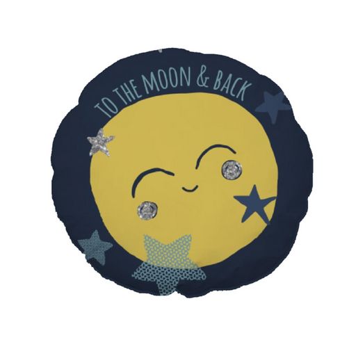 Coussin bleu lune de 35 cm de diamètre de la collection HOME - Future home en coton.Notre coussin en forme de lune offrira à la chambre de votre enfant, une touche en plus qui réveillera votre décoration.Imprimé recto et conçu en 100% coton, ce coussin fera l'unanimité chez les grands comme les peti