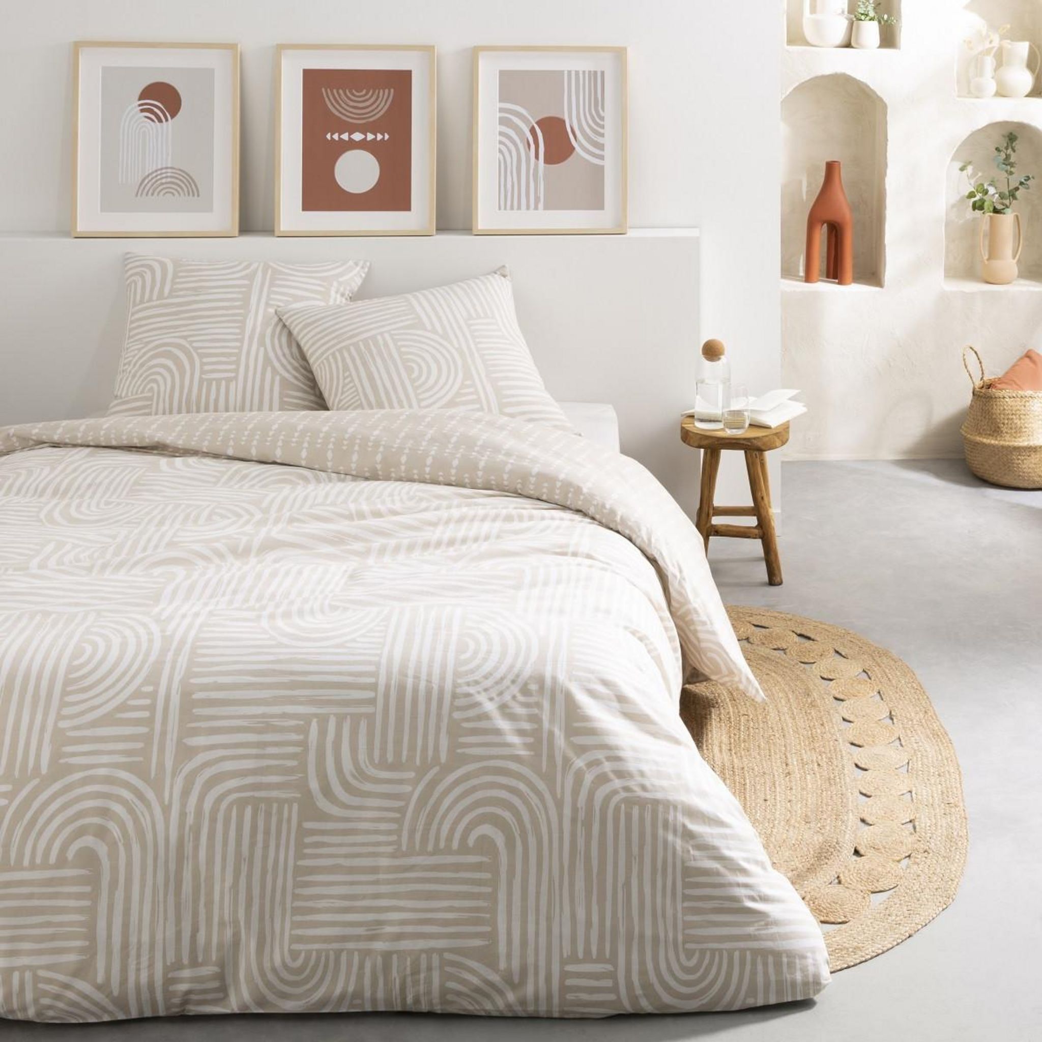 Parure de lit en coton réversible imprimé géométrique 57 fils beige comprenant 1 housse de couette + 2 taies d'oreiller 63x63cm. Avec notre parure de lit FADO en 100% coton, nous avons opté pour un mélange géométrique et bohème, inspiration îles grecques.