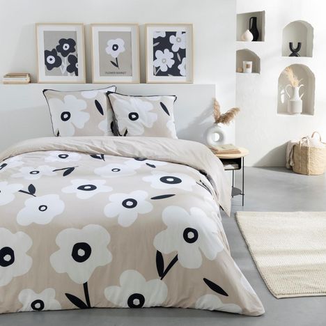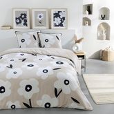 Parure de lit en coton réversible imprimé fleurs 57 fils beige comprenant 1 housse de couette + 2 taies d'oreiller 63x63cm.