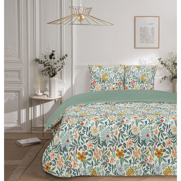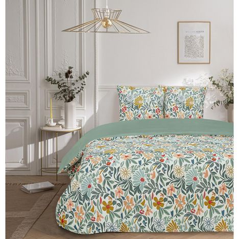 Son imprimé floral aux tons verts et rouges se déploie avec délicatesse sur un fond blanc lumineux, apportant une ambiance à la fois vivifiante et élégante. Parfaite pour tous les styles de décoration, cette parure insuffle une note de nature et de légèreté à votre espace nuit.