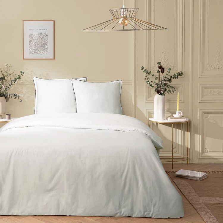 Cette parure intemporelle s'intègre parfaitement à tous les styles de décoration, créant une ambiance douce et apaisante. Réalisée en coton satin 120 fils d'une qualité exceptionnelle, elle offre un toucher délicieusement soyeux pour des nuits de sommeil réparatrices. Sa finition volant et bourdon noir sur les taies apportent une touche sobre et élégante.