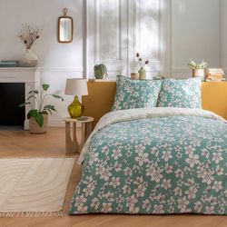 Parure de lit en coton réversible imprimé floral 57 fils bleu vert comprenant 1 housse de couette + 2 taies d'oreiller 63x63cm.