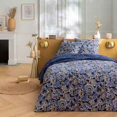 Parure de lit en coton réversible imprimé floral 57 fils bleu comprenant 1 housse de couette + 2 taies d'oreiller 63x63cm.