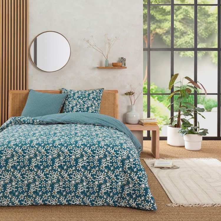 Parure de lit en coton réversible imprimé floral 57 fils bleu comprenant 1 housse de couette + 2 taies d'oreiller 63x63cm.