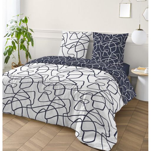 Doté d'un imprimé abstrait en bleu marine et blanc et d'un design réversible, cet ensemble vous permet de changer de style facilement. Fabriqué en 100% coton de haute qualité, il offre un toucher doux et agréable pour des nuits sereines. Le tissage de 57 fils assure une durabilité et un confort optimal.
