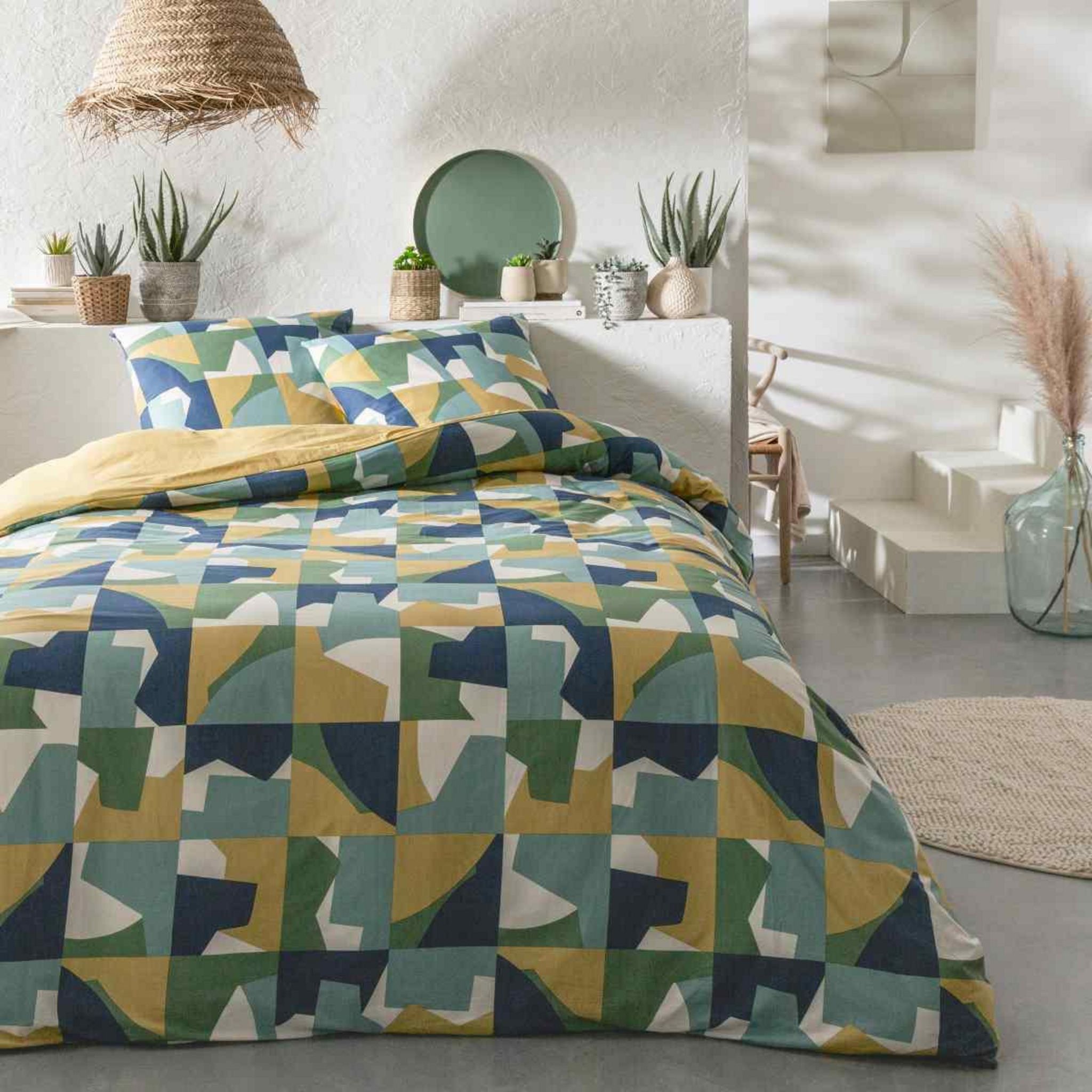 Parure de lit en coton réversible imprimé géométrique 57 fils vert comprenant 1 housse de couette + 2 taies d'oreiller 63x63cm.