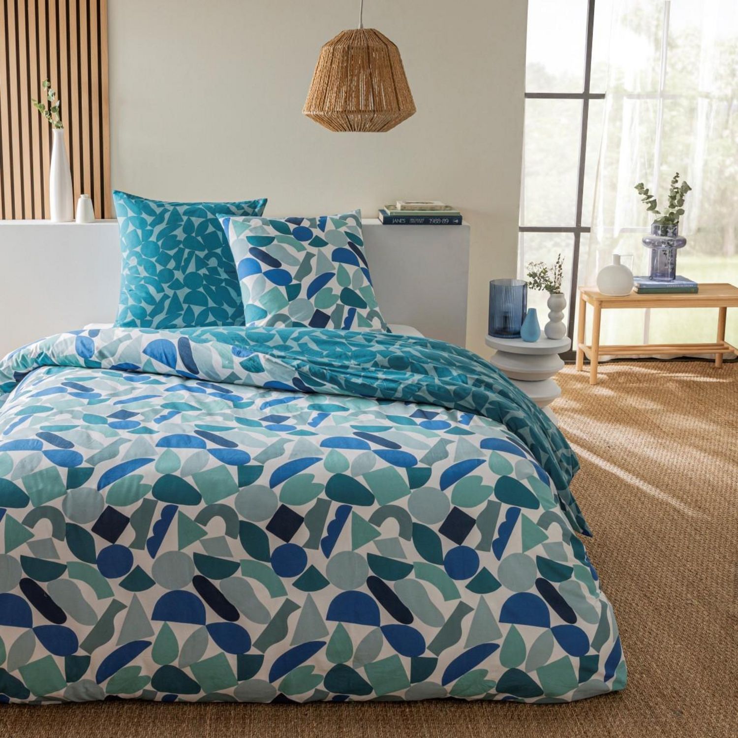 Parure de lit en coton réversible imprimé géométrique 57 fils bleu et vert comprenant 1 housse de couette + 2 taies d'oreiller 63x63cm.