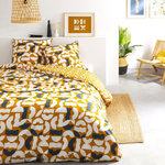 Parure de lit en coton réversible imprimé géométrique 57 fils curry comprenant 1 housse de couette + 2 taies d'oreiller 63x63cm.