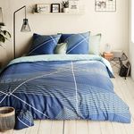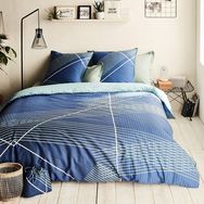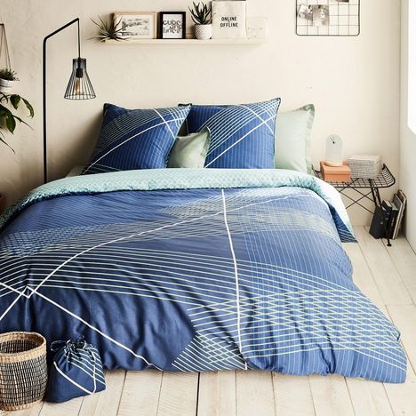 Parure de lit en coton réversible imprimé graphique 57 fils bleu comprenant 1 housse de couette + 2 taies d'oreiller 63x63cm.