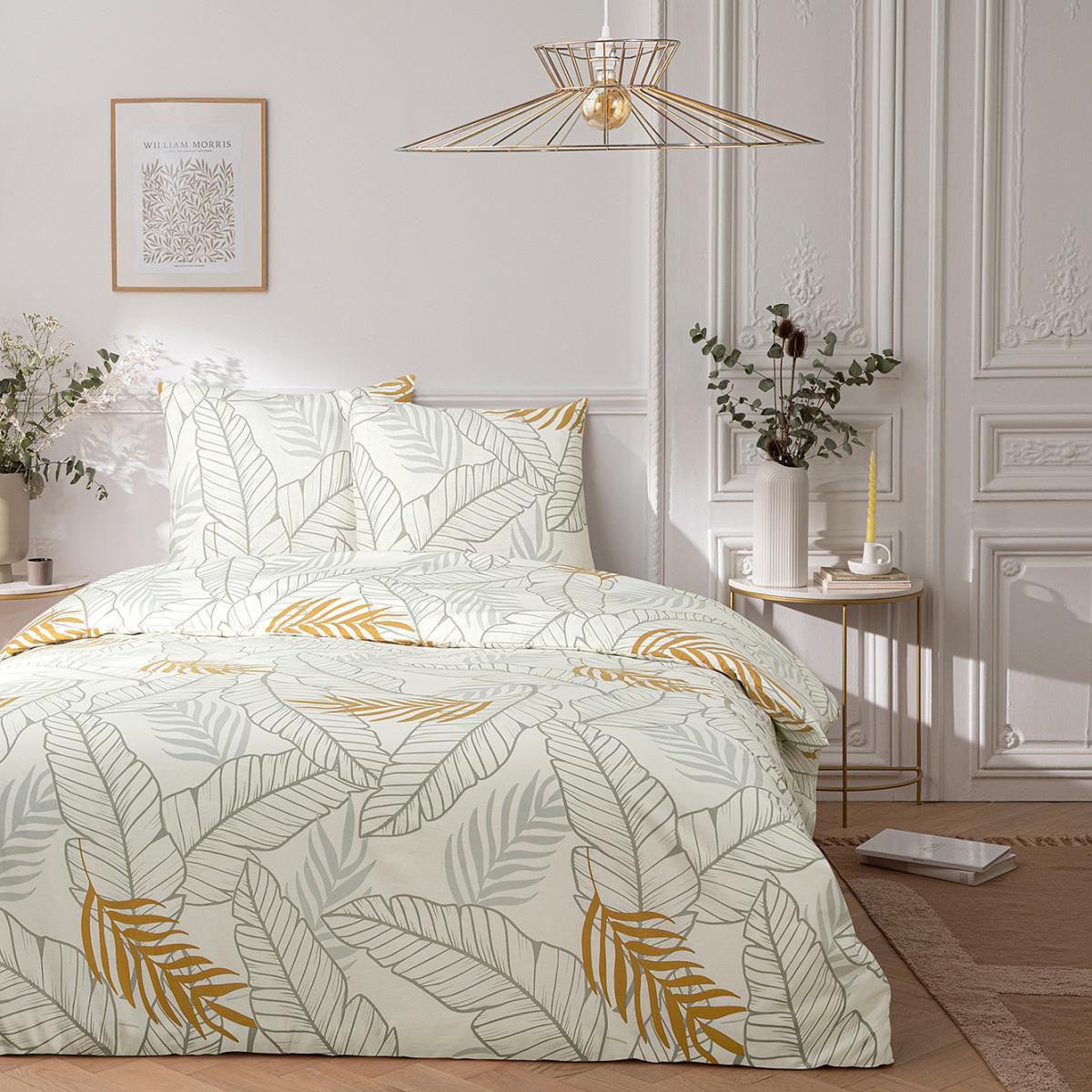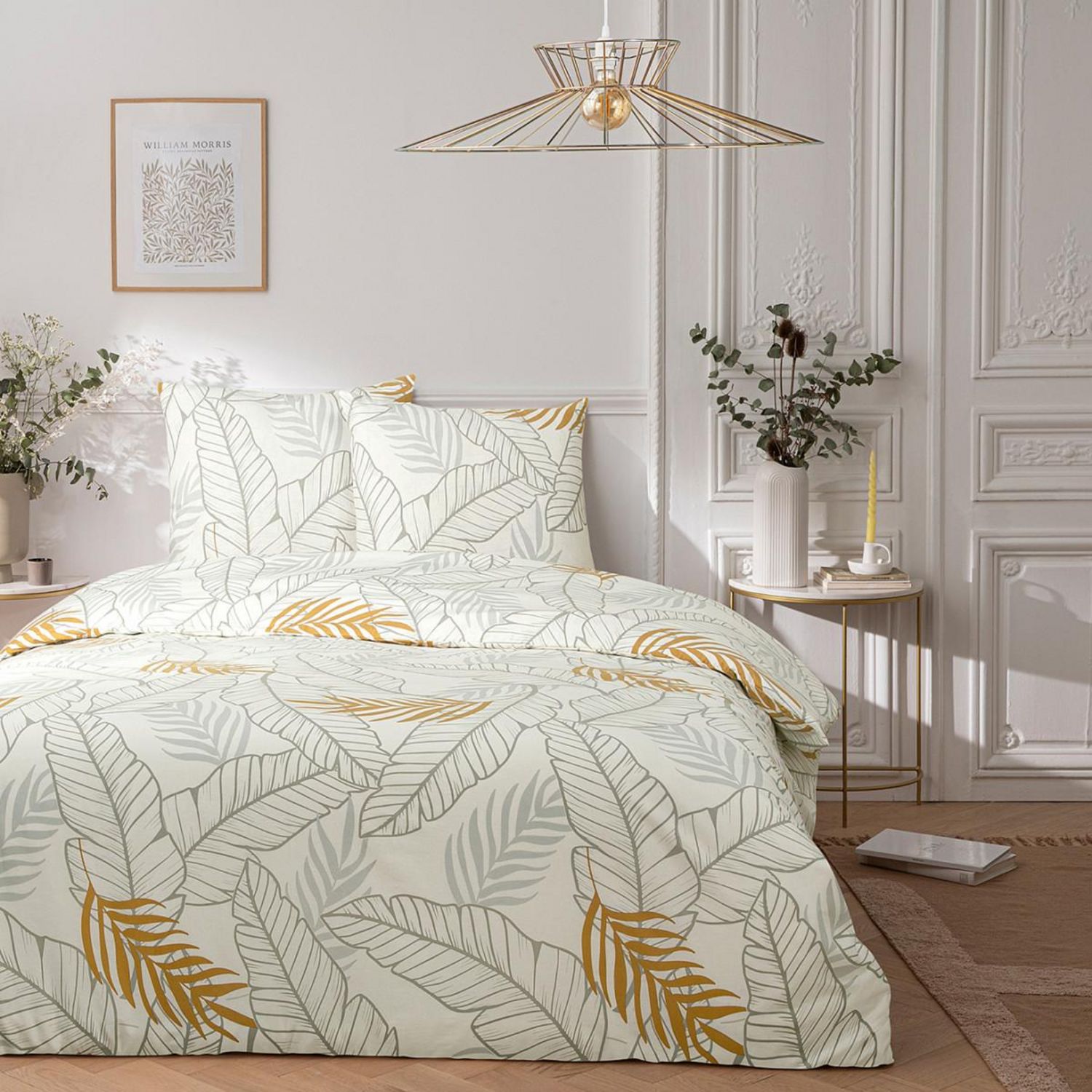 Orné d'un délicat imprimé de feuilles dans des tons de gris et d'ocre sur fond écru, cet ensemble réversible vous permet de varier l'ambiance de votre chambre en un clin d'œil. Réalisé en coton 57 fils, il offre une douceur agréable pour des nuits réparatrices et un confort optimal.
