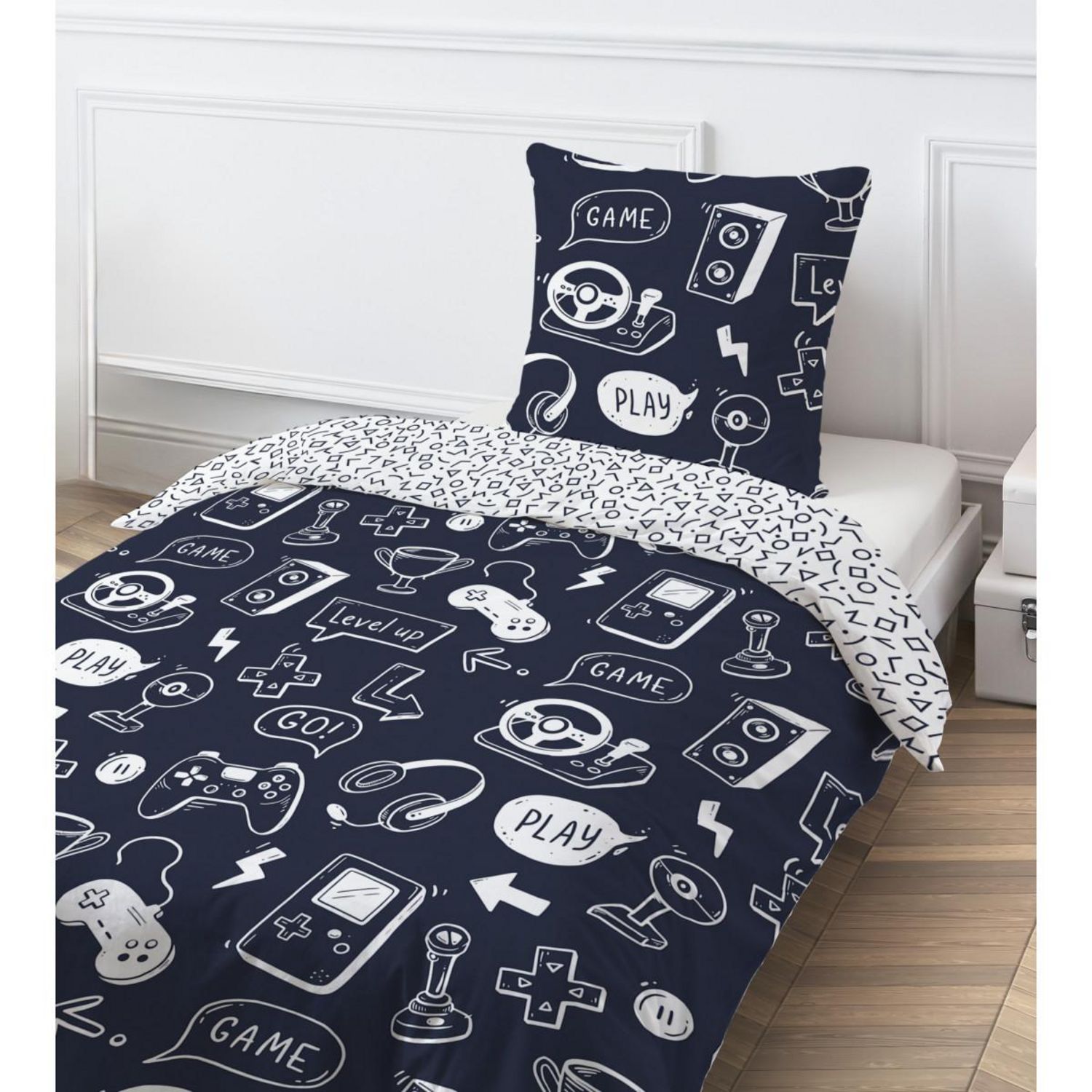 Avec son imprimé blanc inspiré de l'univers gaming sur un fond bleu marine, cette parure plonge votre espace dans une ambiance dynamique et moderne. Parfaite pour les amateurs de jeux vidéos, elle apporte une note originale tout en s'intégrant facilement à votre décoration.