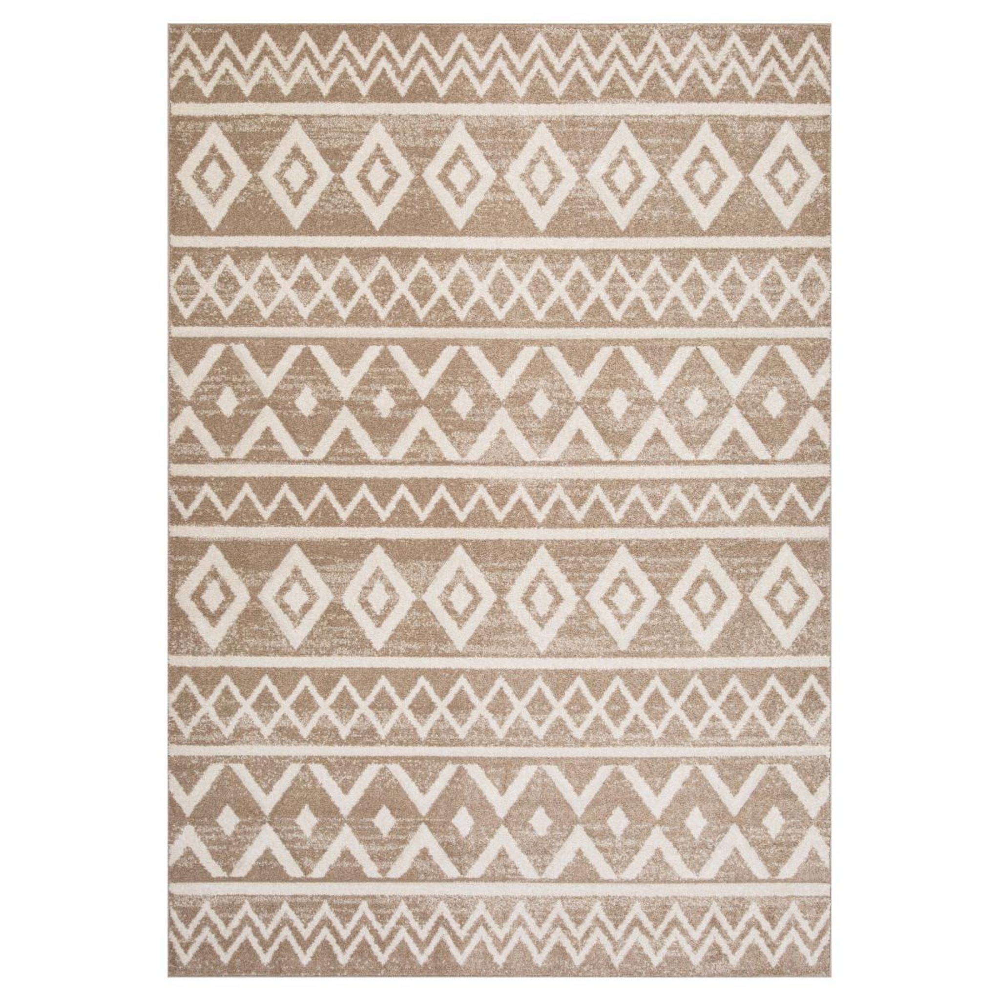 Le tapis MUMBAI en polypropylène est l'accessoire idéal pour ajouter une touche ethnique et chaleureuse à vos espaces intérieurs. Son toucher doux et son fond beige subtilement agrémenté de motifs géométriques tels que des losanges et des lignes apporte une allure authentique et originale, parfaite pour rehausser tout type de décoration.