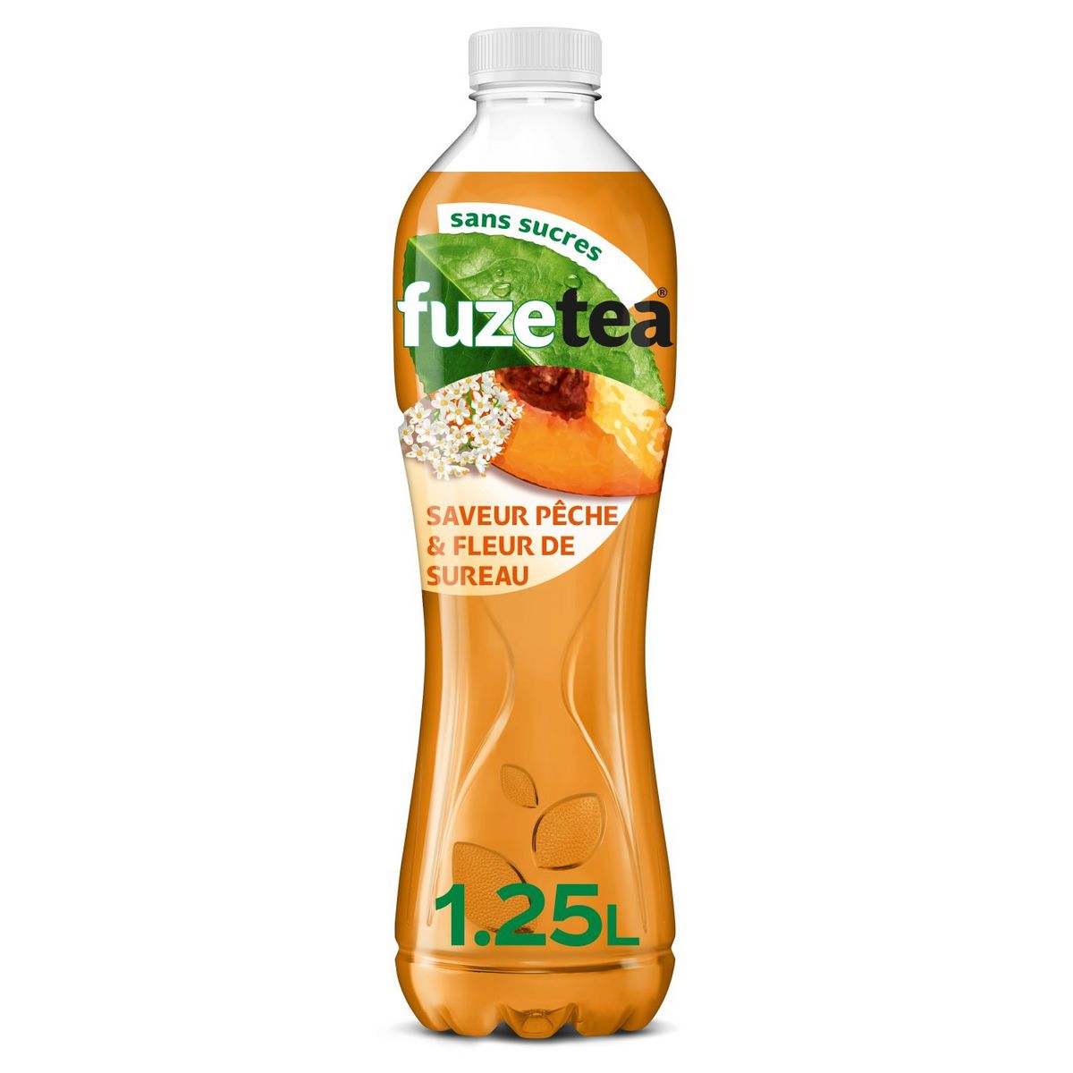 Boisson rafraîchissante à l’infusion concentrée de thé noir saveur pêche, thé et fleur de sureau, avec édulcorants.