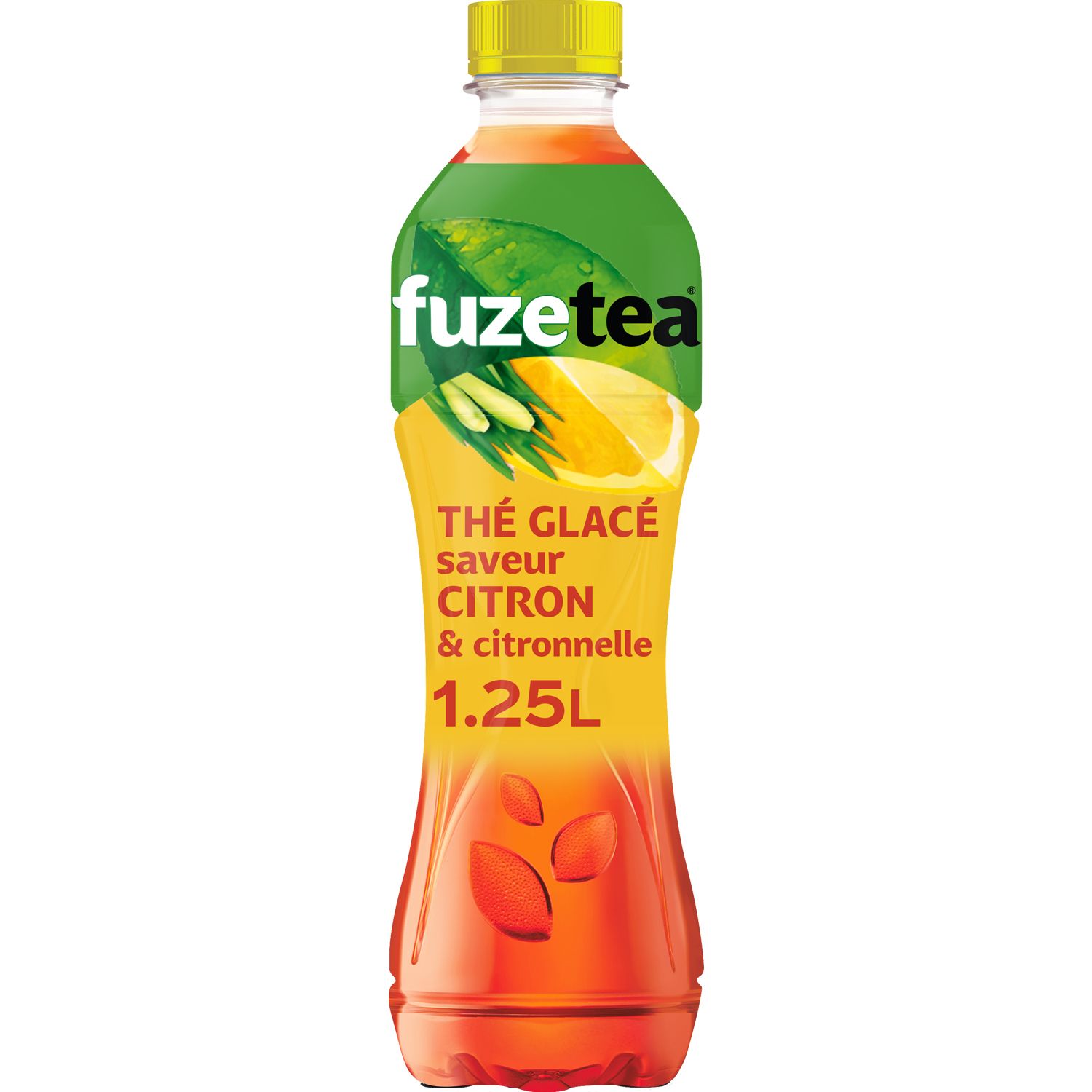 Boisson rafraîchissante aux extraits de thé, saveur citron et citronnelle, avec sucre et édulcorant.