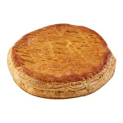 Feuilletage garni de pomme . Ingredients: galette pomme (pate feuilletee 59% (farine de BLE, BEURRE (LAIT) 33%, eau, sel), compote 39% (puree de pommes concentree 85%, sucre), dorure 2%: OEUFS. Peut contenir des traces de soja, noisettes, amandes, noix de pecan, pistache), sirop (sucre, eau). Contient une feve.