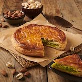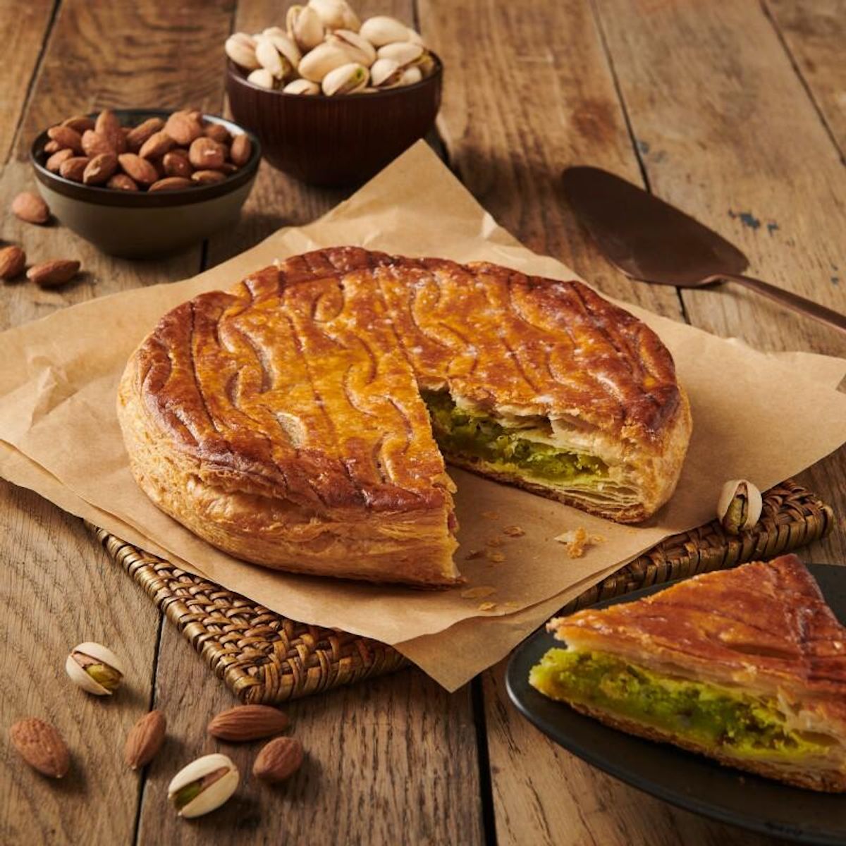 Délicieuse galette : un vrai feuilleté, bel épaisseur de frangipane et de crème de pistache !! Une merveille !!
