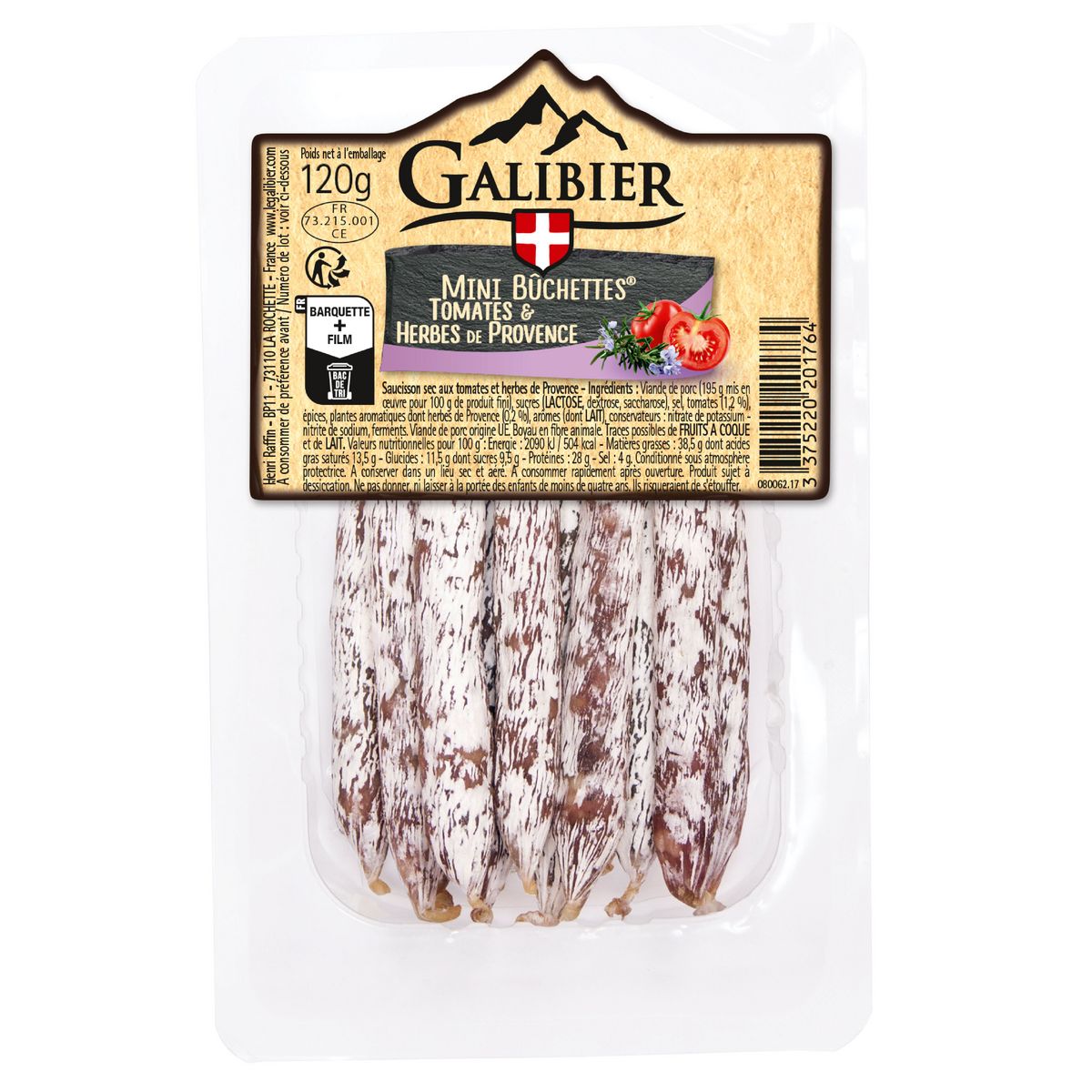 Ingrédients : Viande de porc (195g mis en œuvre pour 100g de produit fini), sucres (LACTOSE, dextrose, saccharose), sel, tomates 1,2%, épices, plantes aromatiques dont Herbes de Provence 0,2%, arômes (do