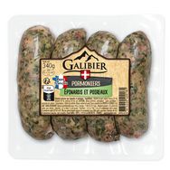 Ingrédients : Viande de porc (75%), épinard (9%), poireaux (9%), sel, LACTOSE, épices, dextrose, antioxydant : E300 - E301, conservateur : nitrite de sodium. Boyau naturel de porc. Présence possible de fruits à coque et de lait.