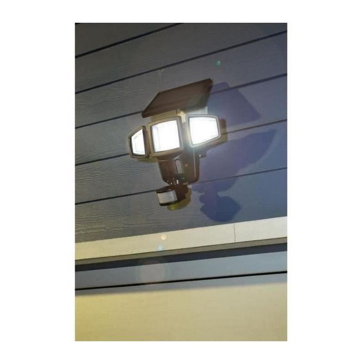 Projecteur/spot solaire - détecteur de présence et panneau solaire déporté - 3 tetes tres éclairantes Matiere : plastique Lumens : 1500 Durée d'éclairage : 30 - 60 - 120 Dist. de détection : 10m max Interrupteur ON / OFF / AUTO 5m de câble entre le panneau sol. et le spot 182 LED SMD blanches 2 x1800mAh 3,7V Li-on 18650