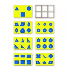 Les encarts géométriques initient l'enfant à la géométrie plane. Un ensemble de 35 encarts et cadres géométriques. (Armoire vendue séparément)
