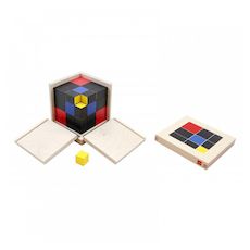 Le Trinomial Cube est une représentation concrète de la formule algébrique (a + b + c)³. Les facteurs de l'équation sont représentés par des cubes et des prismes. L'enfant Montessori du primaire utilise le Cube Trinomial comme activité d'exploration algébrique. Contenu dans une boîte en bois à charnière avec couvercle.